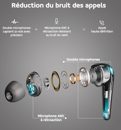 Equipé de 6 microphones, les écouteurs sans fil vous offrent une expérience étonnante lors des appels permettant de supprimer les bruits environnementaux grâce au microphone ANC à rétroaction couplé à un algorithme précis. Les deux autres microphones permettant de détecter la parole et de l’amplifier pour que votre voix soit claire, peu importent l’environnement.