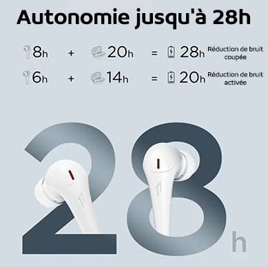 L’autonomie dépend de l’activation de l’ANC, et vous obtenez 6 heures d’autonomie pour chaque écouteur avec l’ANC d’activée et jusqu’à 20 heures avec le boitier de chargement. En désactivant l’ANC, vous obtenez une autonomie de 8 heures par écouteur et jusqu’à 28 heures avec le boitier. La technologie de charge rapide permet en 15minutes d’obtenir une autonomie d’environ 2 heures.