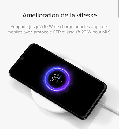 Le chargeur utilise le standard de charge Qi afin de le rendre compatible avec le plus grand nombre de téléphone. Il permet de recharger les téléphones utilisant le protocole Qi EPP en 10W, mais aussi les iPhones, Samsung ou Huawei en 5W. Mais la prouesse de ce chargeur est de pouvoir recharger le Xiaomi Mi 9 en utilisant la charge rapide sans fil 20W.