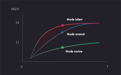 - En mode avancé, vous commencerez à bien connaitre la planche et elle pourra aller jusqu’à 24km/h avec une accélération douce.
