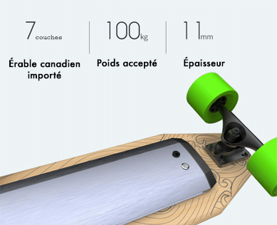 Le corps de skateboard électrique est en alliage d’aluminium utilisé dans l’aviation. Il est construit selon de multiples processus de haute précision, avec une résistance élevée et une dissipation thermique rapide. De plus, la planche est composée de 7 couches d’érable canadien importé, fabriquées en pressage à chaud de haute technologie et en traitement CNC de haute précision permettant de supporter un utilisateur de 100 kg. Legé, le skateboard est facile à transporter (environ 5kg).