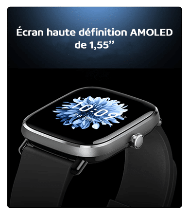 L’Amazfit GTS 2 mini dispose d’un grand écran HD AMOLED de 1.55” permettant un affichage clair. La plupart des cadrans prennent en charge l’Always On Display (AoD) permettant d’afficher l’heure toute la journée.