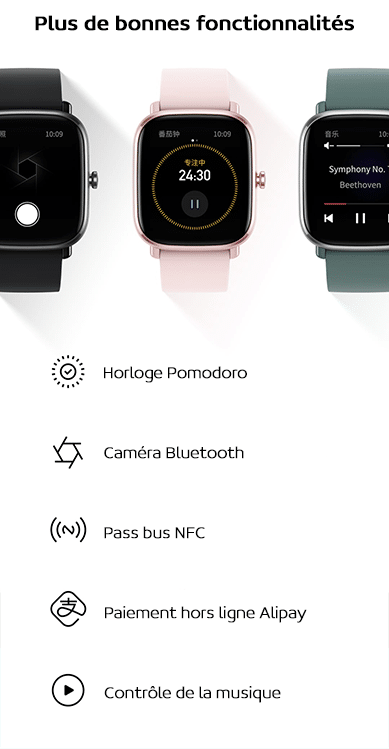 La montre intègre une horloge Pomodoro permettant une gestion du temps travail, mais peut également contrôler le lecteur de la musique. Grâce à la fonction NFC activée, il est possible de transformer la montre en carte de transport.