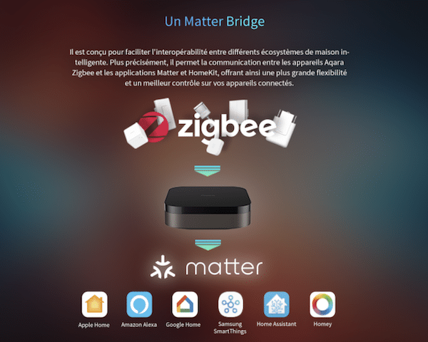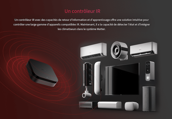 • Pont Matter pour les unités de climatisation infrarouge : il peut intégrer une unité de climatisation compatible infrarouge ou une pompe à chaleur air-air à Matter, permettant le contrôle et l’automatisation de la climatisation via des plates-formes compatibles Matter.