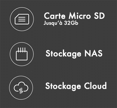Pour enregistrer la vidéo, ajoutez une carte MicroSD pour un stockage en local. Cette méthode est très pratique pour visionner la vidéo à tout moment. Autres solutions, enregistrez la vidéo sur un NAS (disque dur réseau) et pour encore plus de sécurité, directement dans le cloud, ce qui vous permet de sauvegarder des preuves même si votre caméra est détruite ou volée.