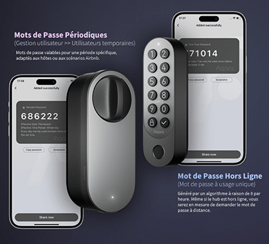 - Codes PIN : des codes personnalisés peuvent être saisis sur le clavier sans fil pré-appairé inclus. De plus, les utilisateurs d’Aqara Home peuvent gérer facilement l’accès par intuition avec non seulement des mots de passe périodiques, mais aussi des mots de passe à usage unique qui peuvent être créés, partagés et utilisés à distance même lorsque la serrure est déconnectée de toutes les plateformes.