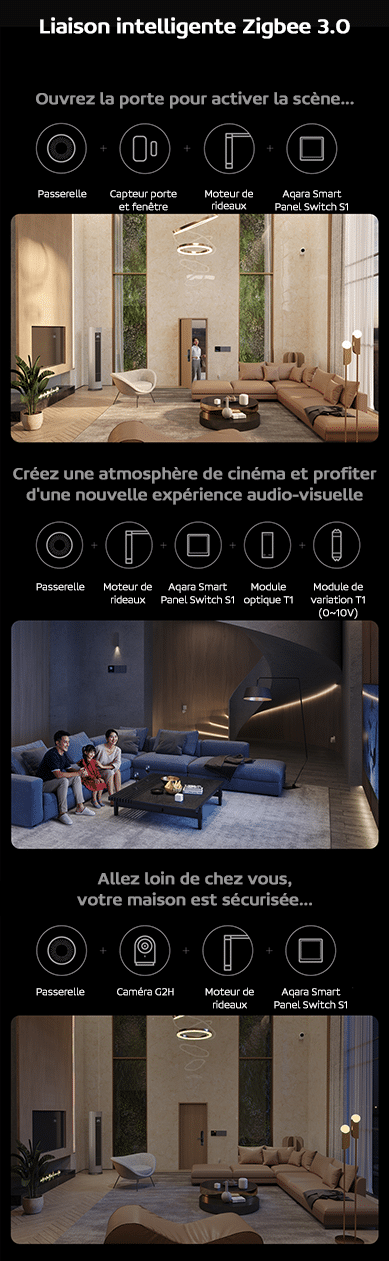 Le panneau tactile d’Aqara peut réaliser le contrôle de l’éclairage, de la température de la climatisation, des scènes de lumière, des moteurs de rideaux, et bien d’autres encore… Mais il est également possible de personnaliser des scènes intelligentes comme un mode cinéma, un mode nuit … Laissez le panneau tactile résoudre vos besoins et améliorez l’esthétique avec une apparence simple !