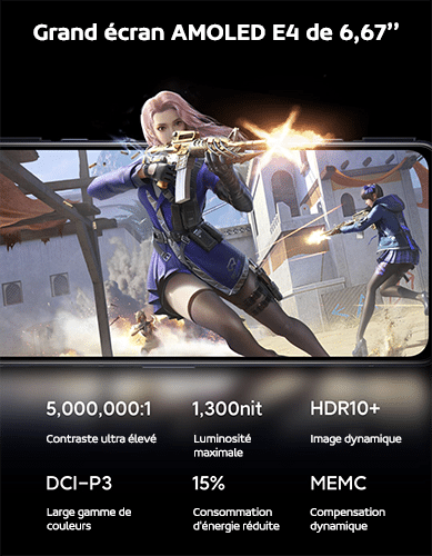 Le BlackShark 4 Pro est équipé d’un grand écran AMOLED Samsung E4 de 6,67’’ qui dispose d’un taux de rafraîchissement de 144Hz. L’écran est fait du matériau luminescent E4 le plus avancé de l’industrie. La précision et la performance des couleurs ont atteint les meilleurs standards de l’industrie. Avec un taux d’échantillonnage tactile allant jusqu’à 720 Hz et la précision tactile la plus faible de l’industrie de 0,004 mm, la réponse tactile du Black Shark 4 Pro dans les scénarios de jeu extrêmes est augmentée de 41 % par rapport à la génération précédente. De plus, le Black Shark 4 Pro prend également en charge trois taux de rafraîchissement d’écran personnalisés parmi 60 Hz, 90 Hz et 144 Hz. L’écran dispose d’un contraste ultra élevé de 5 000 000:1, une luminosité maximale de 1300 nits, une certification HDR10+, une large gamme de couleurs DCI-P3 et surtout une consommation électrique réduite de 15%. La compensation de mouvement MEMC rend cet écran agréable à l’œil. L’écran est percé d’un ultra-petit trou de 2,76mm pour la caméra selfie de 20Mp.