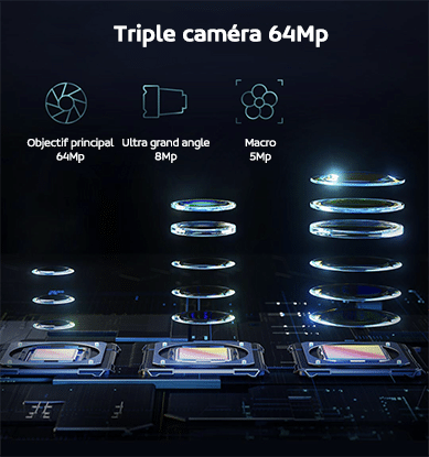 • Capteurs photos arrière : 64Mpx + 8Mpx + 5Mpx