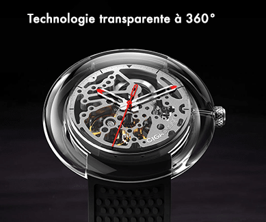 Le boîtier transparent monobloc sert à renfermer le mouvement. Le noyau est en suspension, et vous pouvez pleinement profiter de la beauté du mécanisme. Le moulage sans vis permet de ressentir intuitivement le charme pur de l’art mécanique. La montre a été soumise à 14 polissages manuels et un processus de revêtement PVD au diamant. La dureté globale est augmentée pour rentre la montre plus transparente et résistante à l’usure.