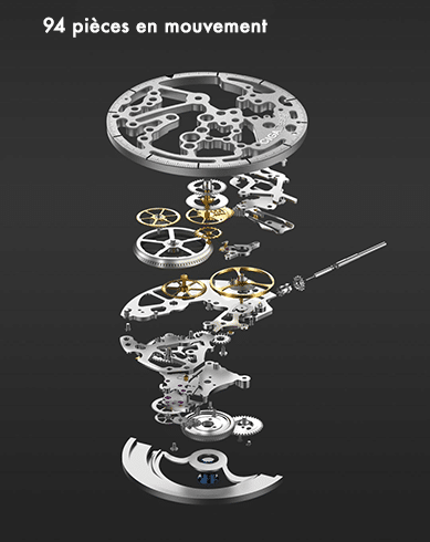 Outre l’aspect esthétique, l’élément le plus important est le mouvement puisqu’il détermine la durée de vie de la montre mécanique. Tant que la montre est portée tous les jours, il est inutile de régler l’heure. Bien que le mécanisme n’ait qu’une taille d’une pièce, il contient tout de même 94 pièces.