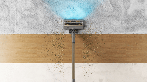 La brosse est dotée de poils disposés en V pour une meilleure aspiration des saletés. Elle intègre également des LED bleues éclairant à un angle de 138° pour aider les utilisateurs à détecter et à éliminer les débris et particules même les plus minuscules des sols et des tapis.