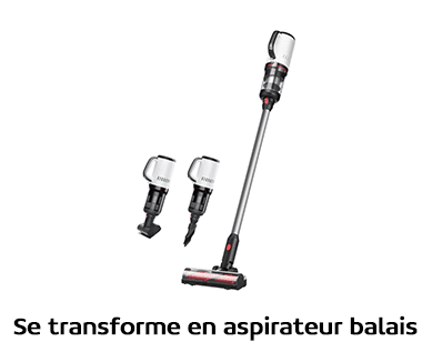 La partie supérieure de l’aspirateur nettoyeur se retire et une fois le bac à poussière ajouté, il se transforme en un aspirateur balais. Le bac a poussière a une contenance de 465ml et l’aspirateur une autonomie jusqu’à 60min. Les différents éléments qui permettent de composer cet aspirateur balais peuvent être rangé proprement à côté de la base de rangement.
