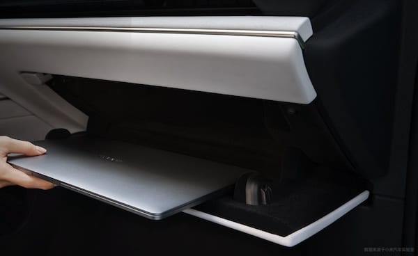La taille de la boîte à gants de la Xiaomi SU7 est très impressionnante et peut accueillir un ordinateur portable de 14’’. L’intérieur est recouvert de flocage, plus respectueux de vos affaires.