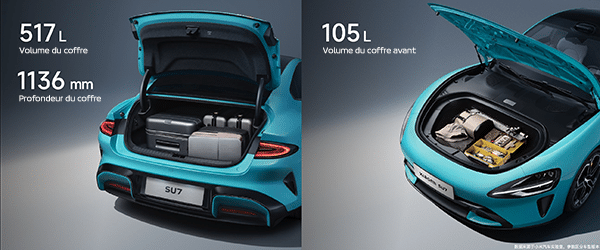 Pour les grands objets à transporter, la Xiaomi SU7 dispose également de grands rangements avec un coffre avant de 105L et un coffre arrière de 517L.