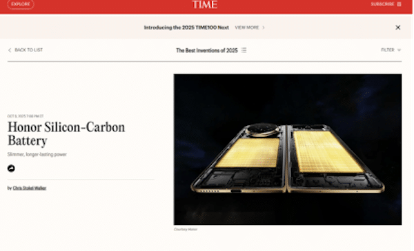 La seconde récompense revient à la batterie au silicium-carbone d’HONOR, une percée technologique majeure qui redéfinit les standards de performance énergétique. En intégrant 25 % de silicium dans ses cellules, HONOR a réussi à concevoir une batterie de seulement 2,3 mm d’épaisseur offrant une capacité de 6 100 mAh. TIME a salué cette prouesse, qui permet aux appareils comme le HONOR Magic V5, le smartphone pliable le plus fin au monde, de conjuguer élégance, finesse et endurance.