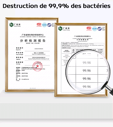 La LED UVC émet une lumière UVC avec une énergie photonique élevée permettant de détruire 99,9% des bactéries. Ainsi la tête de votre brosse est parfaitement saine.