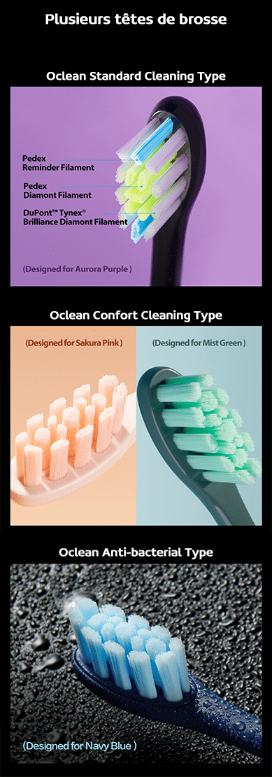 - Tête de brosse antibactérien : Approuvée par la FDA, les courbes douces améliorent le confort. Le matériau utilisé est antibactérien.