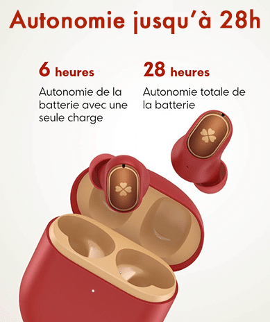 La marque a intégré une puce basse consommation, permettant d’obtenir une autonomie de 6h par écouteur. L’autonomie peut être augmentée jusqu’à 28h grâce au boitier.