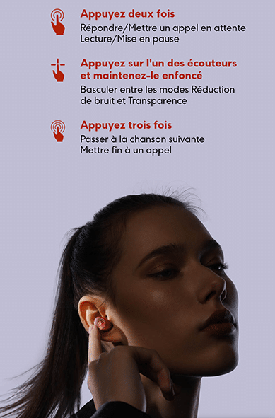 Une commande tactile est disponible sur les écouteurs permettant d’accepter les appels, contrôler la musique ou votre assistant vocal.