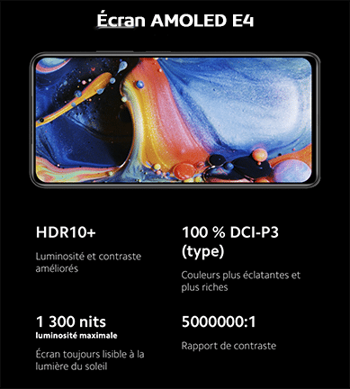 Le Poco F3 est équipé d’un grand écran AMOLED E4 de 6,67’’, un écran couleur primaire percé d’un ultra-petit trou de 2,76mm pour la caméra selfie de 20Mp. L’écran dispose d’un contraste ultra élevé de 5 000 000:1, une luminosité maximale de 1300nits, une certification HDR10+, une large gamme de couleurs DCI-P3 et surtout une consommation électrique réduite de 15%. La fréquence de rafraichissement est de 120Hz et le taux d’échantillonnage tactile est de 360Hz.