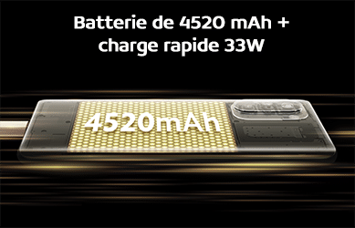 Niveau énergie, le Poco F3 est doté d’une batterie de 4520 mAh. Il est équipé du mode charge rapide filaire 33W permettant le chargement à 100% en 52min. Il est par contre dépourvu de la charge sans fil.
