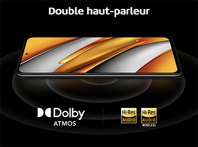 Dolby Atmos est une technologie sonore de haute qualité dérivée des salles de cinéma. Le smartphone dispose de deux haut-parleurs permettant de créer un son immersif. Le Poco F3 a obtenu la certification Hi-Res Audio et Hi-Res Audio Wireless. De plus il intègre une triple configuration micro, intégrant l’option Zoom Audio. Le troisième micro est situé à l’arrière au niveau de la triple caméra et permet à l’appareil de zoomer sur le son avec l’image.
