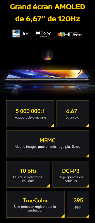 Le POCO F4 GT dispose d’un grand écran AMOLED de 6,67’’, spécialement conçu pour jouer à des jeux. L’écran a remporté la note A+ de DisplayMate, une agence internationale d’évaluation des écrans, et a atteint 15 nouveaux records. Le taux de rafraichissement est de 120Hz et le taux d’échantillonnage tactile est de 480Hz ! L’écran dispose d’un contraste ultra élevé de 5 000 000:1, une certification HDR10+  et une large gamme de couleurs DCI-P3. L’écran couleur primaire professionnel dispose d’une précision bien supérieure à la norme de l’industrie (JNCD ≈ 0,18  △E ≈ 0,30). La technologie de gradation PWM haute fréquence 1920Hz réduit considérablement l’inconfort causé par le scintillement stroboscopique aux yeux dans les situations de faible luminosité. L’écran est protégé par une vitre Corning Gorilla Glass Victus et le haut percé pour la caméra selfie de 20Mp, Sony IMX596.