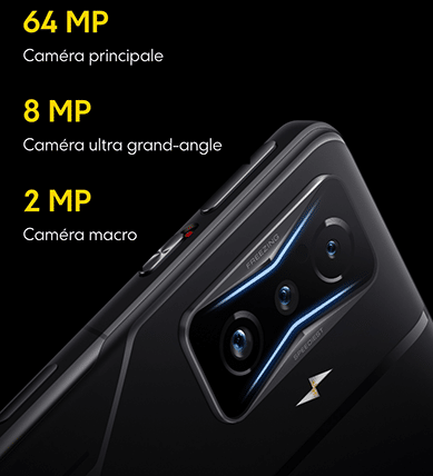 Le verre AG au dos de l’appareil offre un toucher délicat et est disponible en 3 couleurs (Argent sidéral, Jaune POCO et Noir absolu). La découpe originale pour le bloc photo renferme la triple caméra 64Mp avec un système déclairage de jeu RVB :