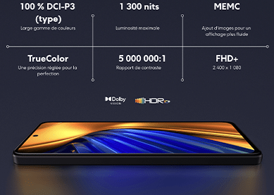 Le Poco F4 est équipé d’un grand écran AMOLED E4 de 6,67’’, un écran couleur primaire percé d’un ultra-petit trou de 2,76mm pour la caméra selfie de 20Mp. L’écran dispose d’un contraste ultra élevé de 5 000 000:1, une luminosité maximale de 1300nits, une certification HDR10+, une large gamme de couleurs DCI-P3 et surtout une consommation électrique réduite de 15%. La fréquence de rafraichissement est de 120Hz et le taux d’échantillonnage tactile est de 360Hz. L’écran est protégé par un verre de protection Corning Gorilla Glass 5.