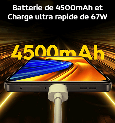 Niveau énergie, le Poco F4 est doté d’une batterie de 4500 mAh. Il est équipé du mode charge rapide filaire 67W permettant le chargement à 100% en 38min seulement. Cette vitesse de charge est rendue possible par l’utilisation de la technologie MMT qui permet à l’énergie de se séparer en deux direction pour charger plus rapide tout en préservant la batterie.