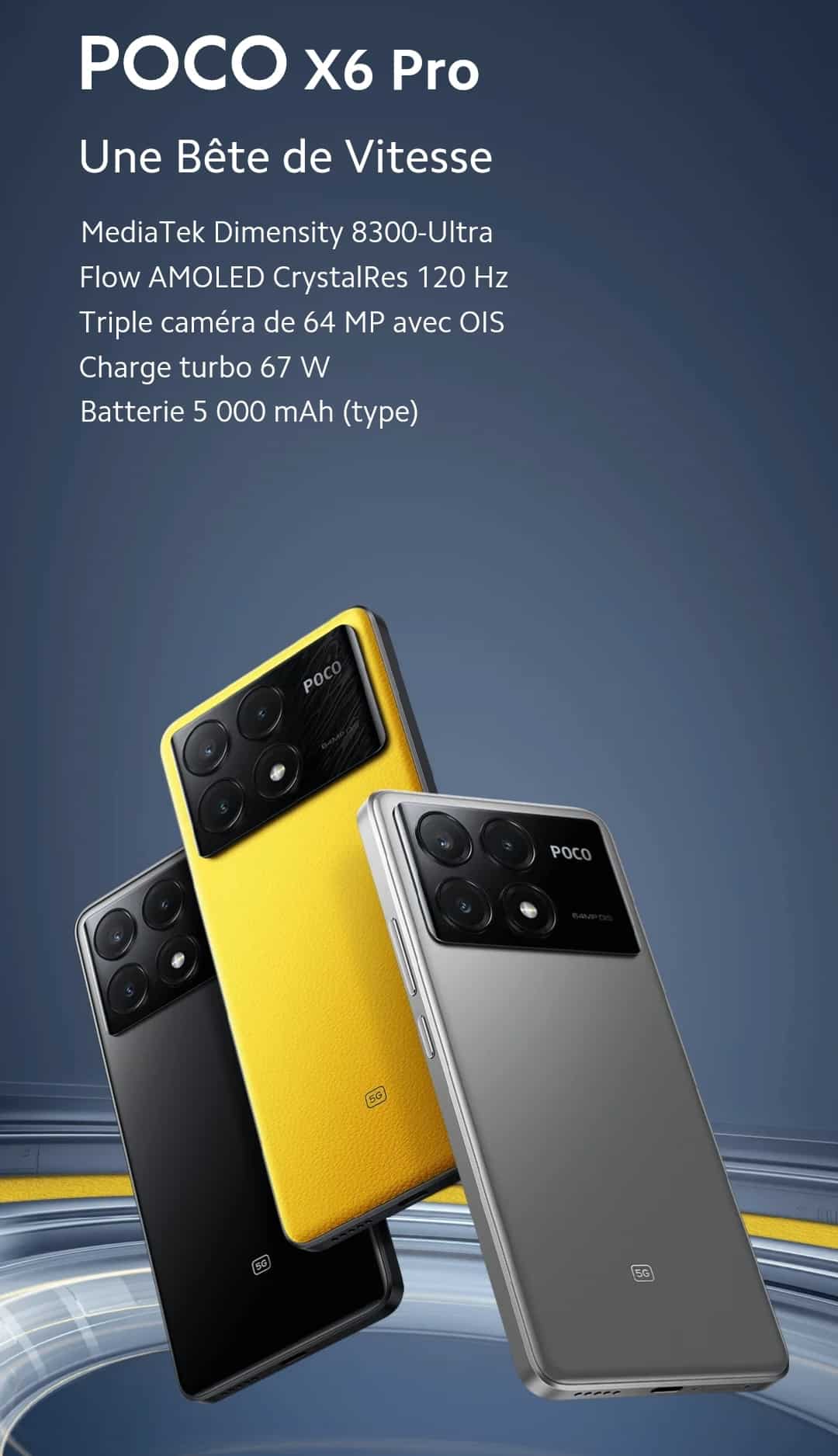 Le POCO X6 Pro 5G disponible en trois couleurs : Noir, Jaune et Gris et en version 8Gb + 256Gb et 12Gb + 512Gb avec pour le lancement une réduction de 40€ pour la version 12Gb + 512Gb.