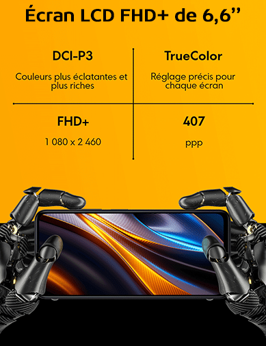 Le POCO X4 GT est équipé d’un écran LCD FHD+ de 6,6’’. Le taux de rafraîchissement est de 144Hz avec la fonction DynamicSwitch permettant de s’adapter à ce que vous faites garantissant une expérience plus agréable tout en préservant l’autonomie (7 phases de 30 à 144Hz). Le taux d’échantillonnage tactile est de 270Hz offrant une réactivité précise à chacun de vos mouvements. Il prend en charge la technologie TrueColor et la gamme de couleurs DCI-P3 permet une performance des couleurs mieux optimisée et une précision des couleurs optimale. L’écran est percé pour la caméra selfie de 16Mp.