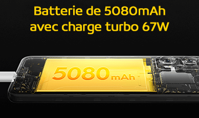 Le POCO X4 GT est doté d’une grande batterie de 5080 mAh. Il sera possible de le recharger rapidement avec la charge turbo de 67W et la technologie MMT. Cette technologie MMT (Middle Middle Tab) permet une charge plus rapide en délivrant le courant au milieu de la batterie et ainsi une charge simultanée du haut et du bas. Le téléphone est ainsi totalement rechargé en seulement 46min.