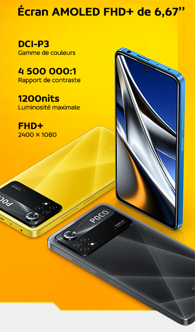 Le POCO X4 Pro 5G est équipé d’un écran AMOLED FHD+ de 6,67’’ pour profiter de couleurs vives avec une large gamme de couleurs DCI-P3 et un rapport de contraste de 4 500 000:1. Le taux de rafraîchissement de 120Hz permet d’obtenir la fluidité que vous jouiez et que vous parcouriez du contenu et le taux d’échantillonnage tactile est de 360Hz offrant une expérience plus sensible. La luminosité adaptative ajuste votre écran en fonction de la lumière ambiante, réduisant ainsi la fatigue oculaire. L’écran est percé afin de laisser la place à la caméra selfie de 16Mp.