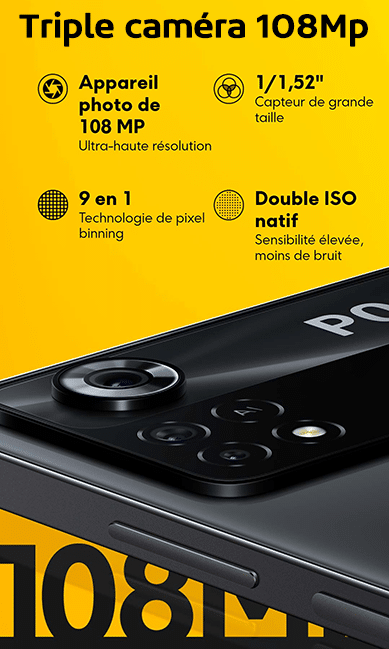 Le POCO X4 Pro 5G opte pour un design plat scintillant et compact entièrement repensé. Le capteur d’empreinte qui permet de déverrouiller le téléphone est dissimulé dans le bouton power. Le téléphone est disponible en 3 couleurs (Laser Black, Laser Blue, et POCO Yellow) et accueille la triple camera 108Mp :