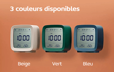 L’écran LCD est recouvert d’un film polarisant offrant un angle de vision plus large et une meilleure visibilité. Le boitier extérieur est en plastique mat, pour une sensation tactile confortable et le réveil est disponible en 3 couleurs : Beige, Vert ou Bleu.
