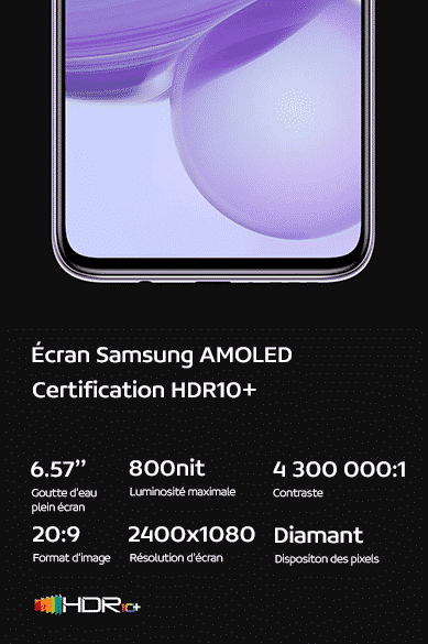 Le Redmi 10X 5G est équipé d’un grand écran AMOLED de 6,57’’ avec un rapport de contraste élevé de 4 3000 000:1, une luminosité de pointe de 800nit et une certification HDR10+. Le capteur d’empreinte permettant le déverrouillage de l’appareil se situe sous l’écran. Il dispose d’une caméra selfie de 16Mp dissimulés dans la mini goutte d’eau en haut de l’écran.