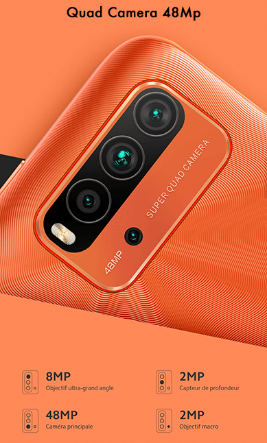 Niveau design, le Redmi 9T garde l’esprit texturé au dos qui empêche les traces de doigts avec en plus un traitement qui le rend résistant aux éclaboussures. Le capteur d’empreinte qui permet de déverrouiller le téléphone est dissimulé dans le bouton power. Le téléphone est disponible en 4 couleurs (Gris carbone, Orange Aurore, Bleu crépuscule et Vert océanique) et accueille la quad camera 48Mp :