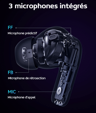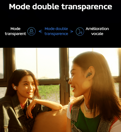 Afin de pouvoir entendre l’environnement sans retirer les écouteurs, il suffit d’activer le mode double transparence avec un mode transparent et également un mode transparent vocal, la voix est ainsi claire et vous pouvez facilement discuter avec votre entourage tout en portant vos écouteurs.
