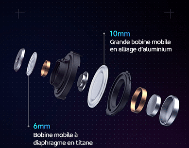 Pour la première fois Redmi utilise une configuration coaxiale à double unité sur un casque anti-bruit. La marque a intégré une grande bobine à diaphragme en alliage d’aluminium de 10mm et une bobine mobile à diaphragme en titane de 6mm. Cette combinaison rend les aigus plus clairs et les basses plus épaisses, et la performance des différents styles est excellente.
