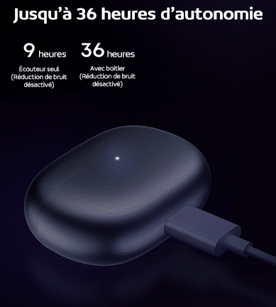 Les écouteurs peuvent être utilisé jusqu’à 9h et avec le boitier de chargement, l’autonomie peut atteindre 36h. Le chargement des écouteurs est réalisé par le boitier et le boitier est rechargé quant à lui par un port USB-C.