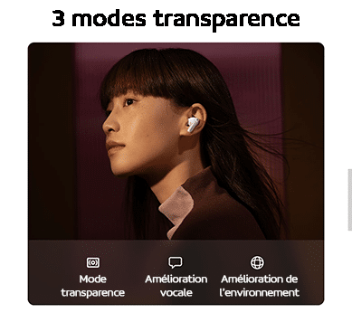 Afin de pouvoir entendre l’environnement sans retirer les écouteurs, il suffit d’activer le mode transparence. On retrouve 3 modes de transparence, vous permettant d’apprécier la musique sans manquer les sons ambiants importants autour de vous (mode transparence, amélioration vocale et amélioration de l’environnement).