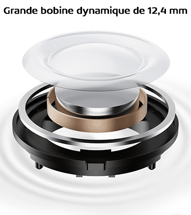 La grande bobine dynamique de 12,4 mm apporte une plus grande zone de vibration et des basses texturées. Le diaphragme recouvert de titane a une bonne rigidité et dureté, et les aigus sont plus purs. Les Redmi Buds 5 ont une structure de cavité arrière indépendante pour garantir une excellente plage de réponse en fréquence dynamique et une cohérence sonore, rendant distinctes les hautes, moyennes et basses fréquences.