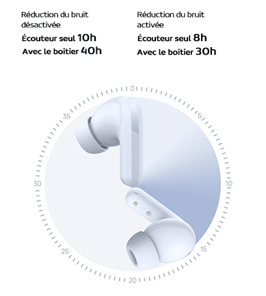 Un écouteur seul dispose d’une autonomie de 10h, et avec le boîtier de chargement, il peut atteindre une autonomie ultra longue de 40 heures, répondant aux besoins d’une utilisation à long terme. Avec la réduction du bruit activée, l’autonomie est réduite à 8h et jusqu’à 30h avec le boitier. Associé à une charge rapide puissante, il faut 5 minutes pour recharger suffisament les écouteur et profiter de 2h de musique…