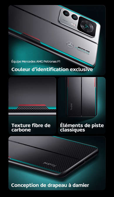 Le dos de l’appareil est disponible en 3 couleurs (Silver traces, Ice blue et Elegant black). De plus, Redmi est le partenaire officiel et exclusif de Mercedes-AMG F1 et propose une version Mercedes-AMG Petronas Formula One Team !  On retrouve également la triple caméra 108Mp :