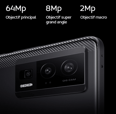 - Objectif principal de 64Mp (Ouverture f/1,79, Pixel 4 en 1 1.4μm, OIS, objectif 6P)