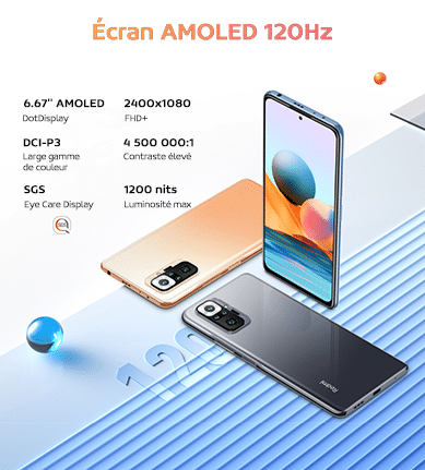 Le Redmi Note 10 Pro est équipé d’un grand écran AMOLED de 6,67’’ percé au centre pour la caméra selfie de 16Mp. L’écran dispose d’un contraste élevé de 4 500 000:1, une luminosité maximale de 1200nits, et une large gamme de couleurs DCI-P3. Le taux de rafraîchissement est de 120Hz et le taux d’échantillonnage tactile est de 240Hz.