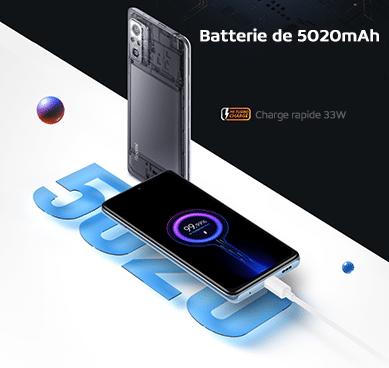 Niveau énergie, le Redmi Note 10 Pro est doté d’une batterie de 5020 mAh. Il est équipé du mode charge rapide filaire 33W. Cette charge rapide permet de recharger le téléphone de 0 à 59% en seulement 30min. Il est par contre dépourvu de la charge sans fil.