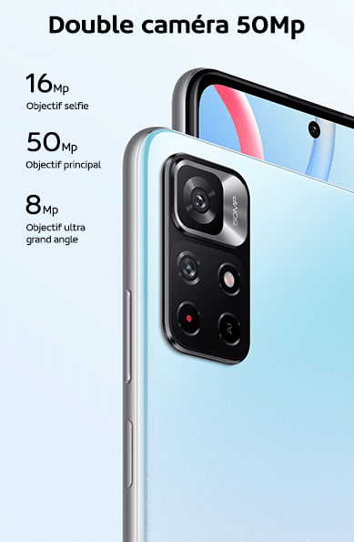 Le Redmi Note 11 5G est biensur compatible 5G (double SIM), la vitesse du réseau est plus rapide. Le téléphone intègre en plus d’une puce NFC Multifonction, du GPS, un port USB-C, une prise Jack, un capteur infrarouge et le Bluetooth 5.1. De plus, le smartphone est certifié IP53, résistant aux éclaboussures d’eau et à la poussière.
